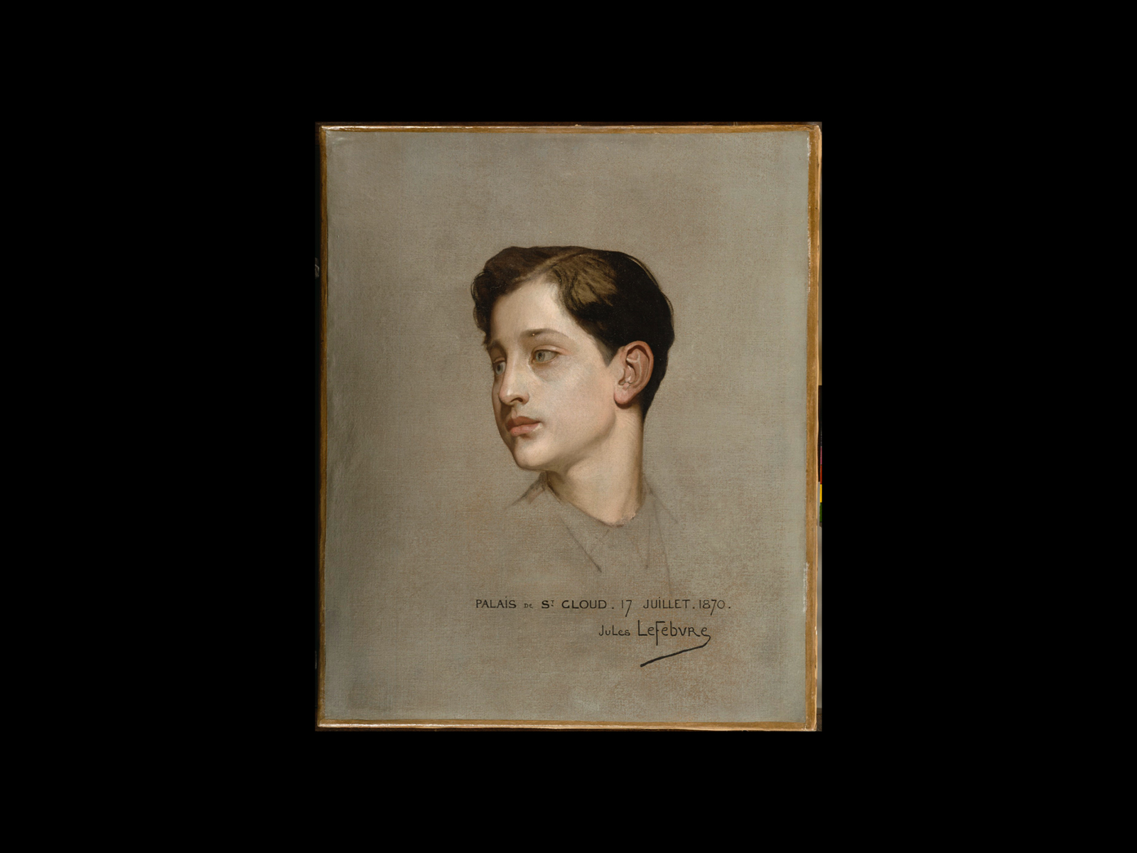 At the time when the prince posed for Jules Lefebvre, it was during the last days of a happy and carefree childhood in the palace at Saint-Cloud, which was his last home in France, and a place he would never see again. The artist made an intimate portrait of the adolescent, with great psychological depth. The face is serious, the smile has deserted his lips, and the expression is sad and nostalgic, as if the son of Napoleon III was aware of the situation. He turns his head to the left of the picture, behind him, towards the already distant memory of the splendours of the empire.101