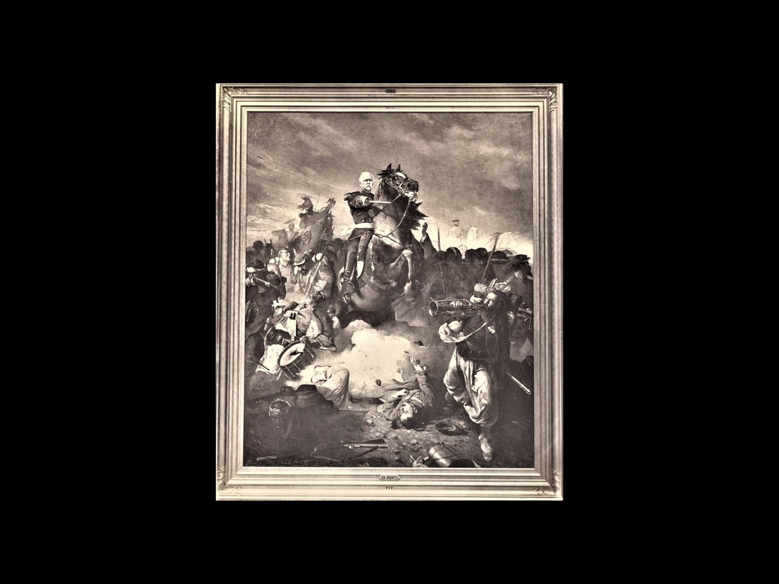 The location of the original painting is unknown. See entry for En avant, Emile Pierre Betsellère in Albums des salons du XIXe siècle ; salon de 1875, Archives Nationales: Album de photographies des œuvres achetées par l'Etat intitulé : "Direction des Beaux-Arts. Ouvrages commandés ou acquis par le Service des Beaux-Arts. Salon de 1875. Photographié par G. Michelez". Œuvres exposées au salon annuel organisé par le Ministère de l'Instruction publique, des Cultes et des Beaux-Arts (Direction des Beaux-Arts), en 1875, au Palais des Champs-Elysées à Paris. Tirage photographique sur papier albuminé représentant : - "En avant !", tableau par Emile Pierre Betsellère, No 191. (Album of photographs of works purchased by the State entitled: "Direction of Fine Arts. Works commissioned or acquired by the Service of Fine Arts. Salon of 1875. Photographed by G. Michelez". Works exhibited at the annual fair organized by the Ministry of Public Instruction, Worship and Fine Arts (Direction des Beaux-Arts), in 1875, at the Palais des Champs-Elysées in Paris.
