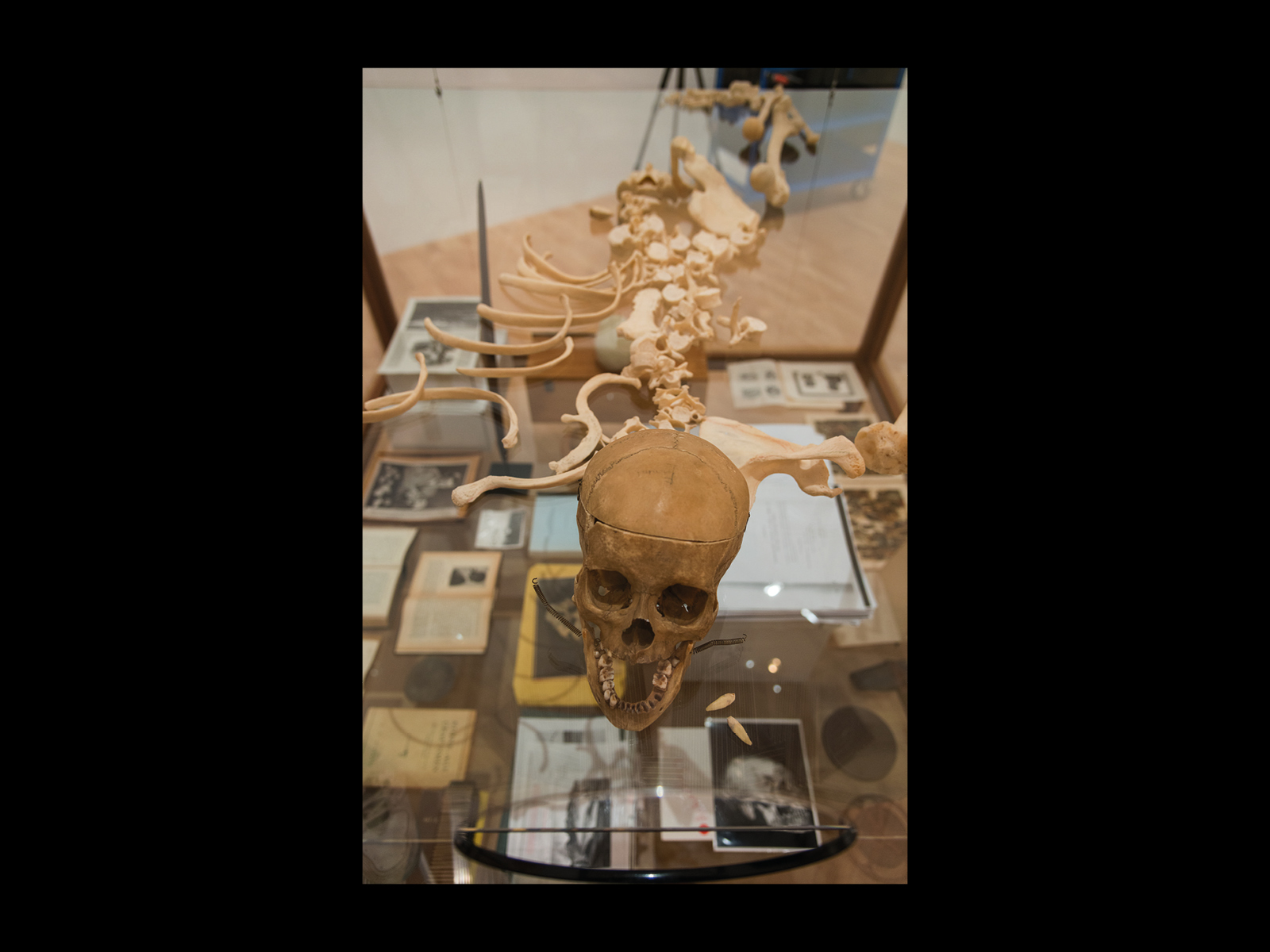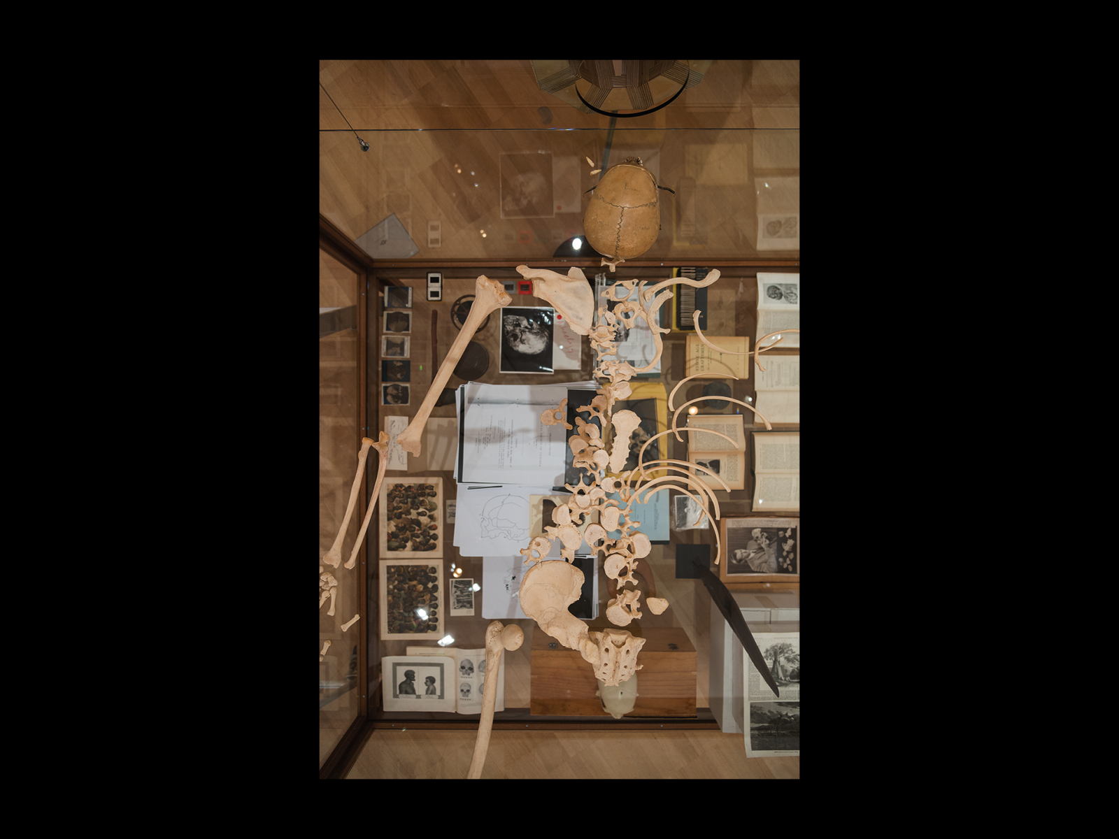 Now we might think of Vox in the light of these remarks, considering how it is consistent with those other works, and how it extends or even breaks with them. To return once more to the material contents of the vitrine, what we have is neither a straightforward anthropological presentation, nor a surrealist juxtaposition, nor even an obvious refusal or parody of museum protocol.12 We have on the bottom level of the vitrine a wide assortment of ethnographic objects, images, writings, film and photographic recordings. At the centre of the vitrine, on top of an unopened archival box, is the photocopied version of Berry’s book, sitting above all of the other objects as though they serve as empirical evidence for its generalisations. Below it, but nevertheless still sitting on boxes, are a Dharug stone axe from Emu Plains, New South Wales, a photo of a tree incised with Wiradjuri markings and a small plastic skull facing out the back of the vitrine. On the bottom level, resting on the glass are a series of drawings and photographs of Aboriginal skulls, a box of slides and thick glass lantern slides laid out next to it, a reel of film, and as though to prove that Berry’s project was not alone, two books by the Director of the Anthropology Museum at the University of Sydney, S.L. Larnach’s Australian Aboriginal Craniology and The Craniology of the Aborigines of Coastal New South Wales. There is a Wiradjuri parrying shield that points upward like an extended finger or an angel’s wing, two colour lithographs at one corner of the vitrine, Ozeanische Völker and Afrikanische Völker, dried emu feathers that look like skeletons and a selection of Andrew’s tourist postcards depicting Indigenous peoples from around the world. Finally, on the upper level of the vitrine, which is held aloft by a series of wires, there is the skeleton on its back with its skull flipped over and up, and seemingly speaking into the gramophone horn to the side. The skeleton lies—or we might even say floats—directly above Berry’s book, implying some sort of relationship between them. If its height above the lower level can evoke a certain transcendence of the material, is this not to suggest a refutation of the fate Berry predicted for Aboriginal people, a kind of living on or immortality? Or is it, on the contrary, the fulfilment of Berry's prediction (and that of other books in the lower half of the vitrine) that Aboriginal people will soon all be as the skeleton collected and studied here?