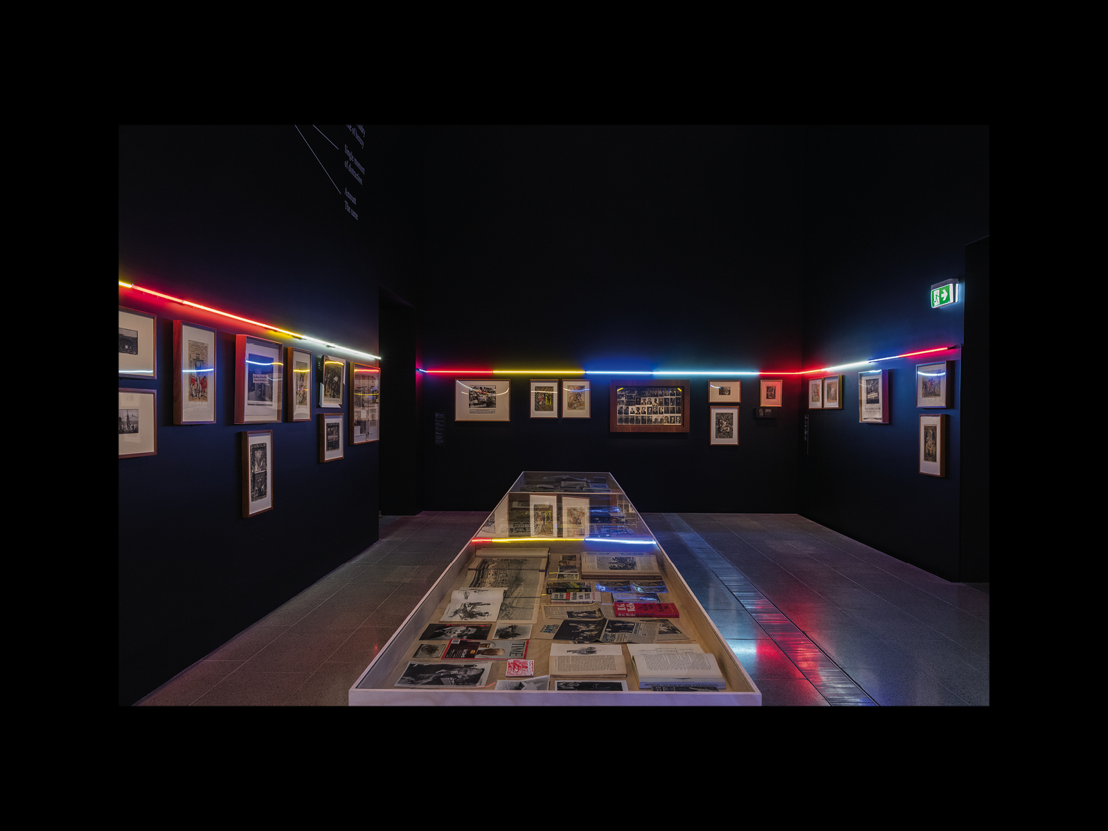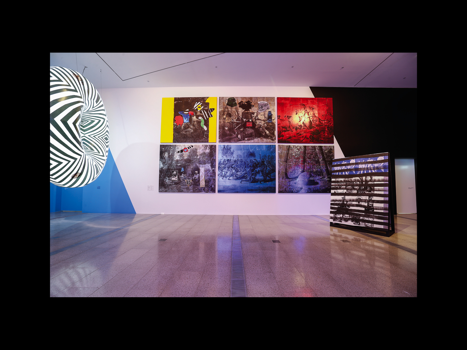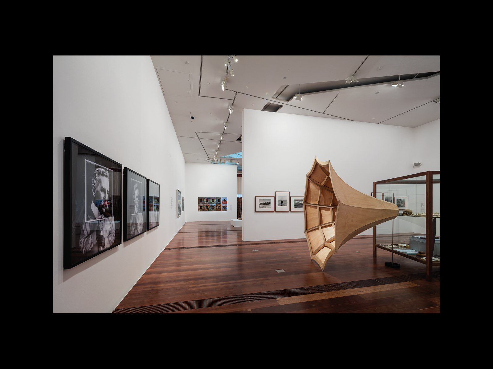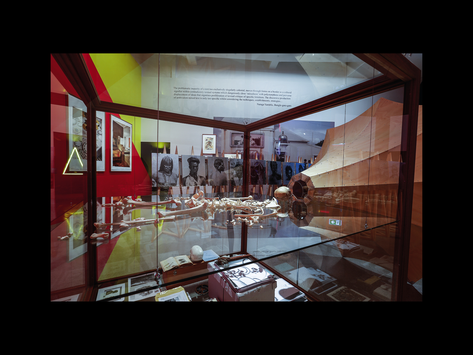 Something like this “framing” is also to be seen in Andrew’s work, even before Colony. Indeed, this aesthetic remaking or remarking of anthropological or ethnographic objects is one of the longest-running and most deeply motivated threads of his practice. Perhaps the first clear instance of it is Sexy & Dangerous (1996), originally shown at the Ian Potter Gallery at the University of Melbourne, in which he enlarged a portrait by the nineteenth-century photographer Charles Kerry of an unidentified Djabugay man from North Queensland in feathered headdress, to which he adds the words “Sexy and Dangerous,” first in Chinese characters and then English. We might think then of Andrew’s installation Menthen . . . Queue Here! (1999), originally exhibited at the Djamu Gallery in Sydney, which consisted of a hundred Aboriginal shields from the vaults of the Australian Museum in Sydney, arranged back to back in two long lines with yellow and black emergency barriers immediately in front of them and on either side blocking the viewer’s immediate access. We might recall as well Andrew's large exhibition Theme Park (2008) at the Museum of Aboriginal Art in Utrecht, which consisted of an enormous variety of both ethnographic and non-ethnographic objects,8 at once packed and unpacked (the exhibition included a section entitled “Corridors and Boxes,” which largely depicted the contents of the museum’s storage facility still on its shelves), along with Andrew’s signature black-and-white inflatables decorated in traditional Wiradjuri dendroglyphic style. Finally, we might speak of Sanctuary: Tomb of the Outcasts (2015), also at the Potter Museum, which featured a wide variety of items on the walls and in the rooms of the gallery (a historical photo of a Indigenous police officer on his horse, the Rogers and Hammerstein album South Pacific next to a newspaper featuring a headline about Australia’s offshore detention policy, books detailing the colonial history of Australia in a pile on the floor). This work also included, like Vox, two purpose-built vitrines, one holding a brass breastplate bearing the words “King Charles of Snowy River 1866,” the other containing, amongst other things, photos of Australian soldiers during World War I, a dugong foetus, an ancient Greek vase, and a letter from the Shell Oil company concerning the proposed hiring of an “enemy alien” then detained in an internment camp during World War II.