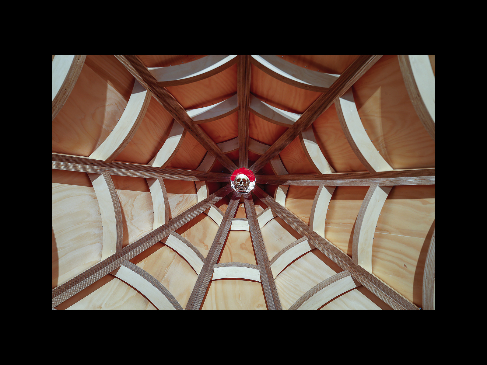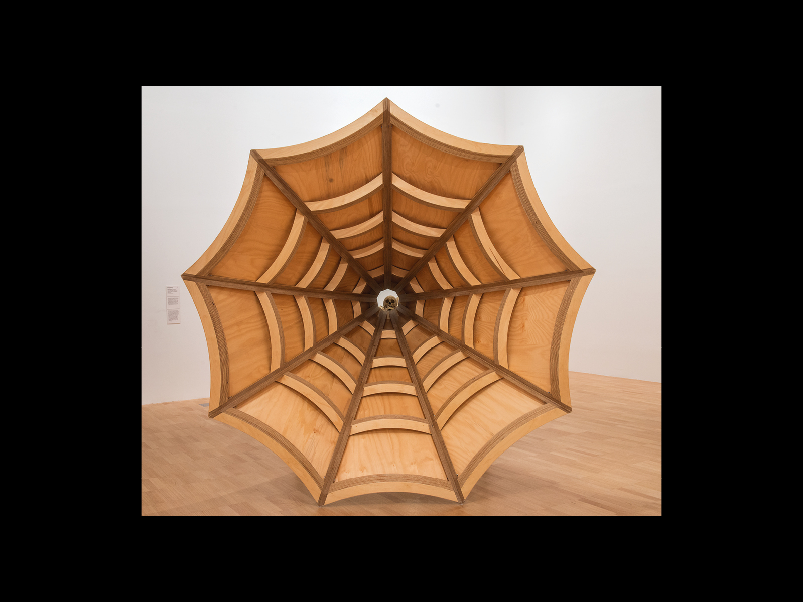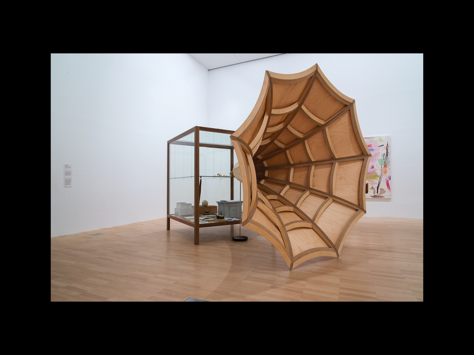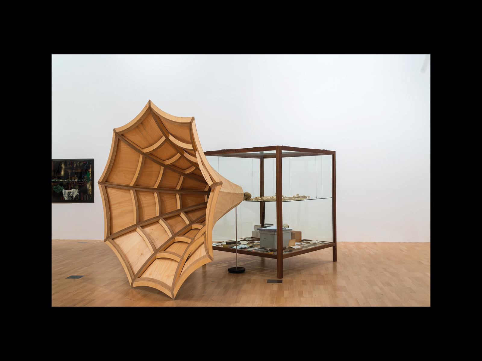These, then, are the contents of the vitrine or display cabinet that makes up Vox—to which we will return in what follows—but perhaps the most notable element of the work (or at least the one we will take as the initiating moment of our discussion here) is what Andrew has attached to the side of the vitrine. It is a large wooden speaker, some two metres high, suspended by a metal stand that opens up as it reaches out into the gallery, as though it were an old-fashioned gramophone horn, casting the apparent meaning of the work (and particularly the voice of the skull that appears to be speaking into it) out to the audience standing before it. In different installations of Vox this amplifier is presented in different ways. For example, in the original version of the work at Tolarno, it is shown simply hanging to the side of the work in an open room. In Splinter of Monuments: A Solid Memory of the Forgotten Plains of our Trash and Obsessions (2014), exhibited at the Museo Reina Sofía in Madrid, the amplifier seems to reach across to another vitrine of objects next to it. And this difference is reflected in the various photographic representations of Vox in books and catalogues, which bring out different aspects of the loudspeaker's relationship to the rest of the work. In its most orthodox or at least most recognisable form, the speaker is depicted standing clearly to the side of the vitrine in an all-over shot of the gallery. But in other reproductions of the work—for example, in the catalogue for the exhibition The Right to Offend is Sacred at the National Gallery of Victoria in 2017—the spectator is positioned looking down into the very mouth of the gramophone as though it is about to swallow them.