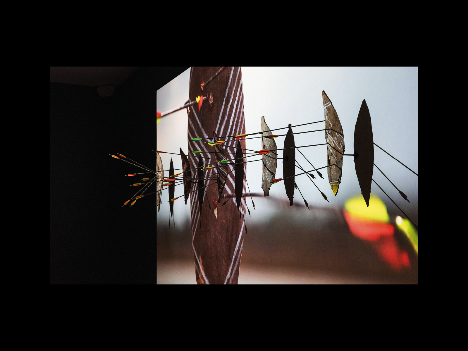 How is this to be seen? What is the difference between art and anthropology in this regard? Or, to put this another way, what does Andrew think he is doing as an artist taking up this anthropological material? How does he imagine remaking or remarking it as his art changes it? In what ways, therefore, are we allowed to think about this anthropological material differently, now that it is presented as a work of art? We attempt to answer these questions largely with regard to Andrew here, but we might begin by looking at the work of a number of the other contemporary Indigenous artists in Colony who re-present anthropological artefacts in a gallery setting. First, there is Christian Thompson’s Othering the Explorer (2015-2016), in which the artist looks through the eyes of a large blown-up photograph of James Cook, held up before his face. Then there is Steaphan Paton’s Cloaked Combat (2013), in which we have arrows fired into a series of Indigenous shields mounted on the wall. And, finally, we have Lorraine Connelly-Northey’s Possum-Skin Cloak (2013), in which a starry night sky made out of barbed wire is surrounded by a variety of hands, feet, and carry bags made out of rusted tin. What would we say is characteristic of all of these works? What method or technique do they all have in common? We would suggest that in all of them there is some kind of indicated distance from their subject matter, almost like inverted commas, which is to point to the fact not so much that the work is appropriated (which it often is) as that what we take to be the subject matter of the work is not its real subject. Or even that it is not so much the subject matter of the work that we meant to engage with as what we might call its form that we are asked to reflect upon. Of course, this aesthetic distance might be true of art itself, but it is perhaps surprising that it is this classical conception that is at stake in contemporary Indigenous art, and moreover that we will always find in this work something operating as the very sign of art itself.
