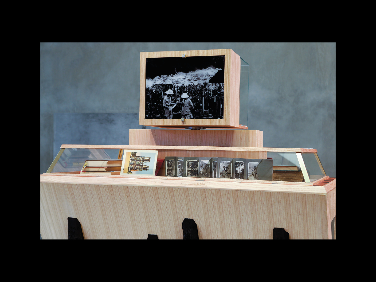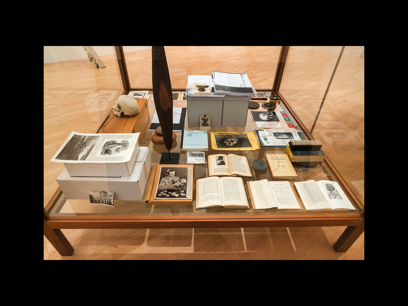 The items on the two levels of the vitrine are not displayed or arranged in a museologically orthodox or conventional way. For example, on the bottom level, we have a series of representations and recordings of a number of Indigenous peoples from around the world (Cape Maria Van Diemen on the North Island of New Zealand, Gabon on the West Coast of Africa, the anthropologist Richard Leakey holding up an Australopithecus skull in Kenya), but without any seeming criteria for which people are represented or the scientific status of the representation. (We have Stone Tools and Camping Places of the Australian Aborigines by S.R. Mitchell, which is a scientific study; but we also have Studies of Savages and Sex by Ernest Crawley, which is obviously a lurid and racially stereotyping book meant for a popular readership). Equally, although many of the items are clearly labelled and displayed (Transactions of the Royal Society of Victoria, Notes from the Bernice Pauahi Bishop Museum), there are also a number that are either leant against boxes or simply unopened, so that what we observe and admire as much as anything is their formal arrangement. Despite the fact that they all apparently come from Andrew’s own personal collection, there are all kinds of different categories of objects included, with some presenting like official anthropological artefacts and recordings (axe, shield, boxes of slides, a reel of film) and others like tourist snapshots or souvenirs. Finally, there is the at once irreconcilable and highly over-determined relationship between Berry’s book on the bottom level of the vitrine and what can only appear to be an actual Aboriginal skeleton (although in fact it is not) on the top. To begin with, this skeleton must strike us as the very object of Berry’s study and the realisation or embodiment of so many of the slides, photographs and recordings on the level below—but within the conventions of contemporary museum practice it is absolutely no longer possible to exhibit actual indigenous remains.5