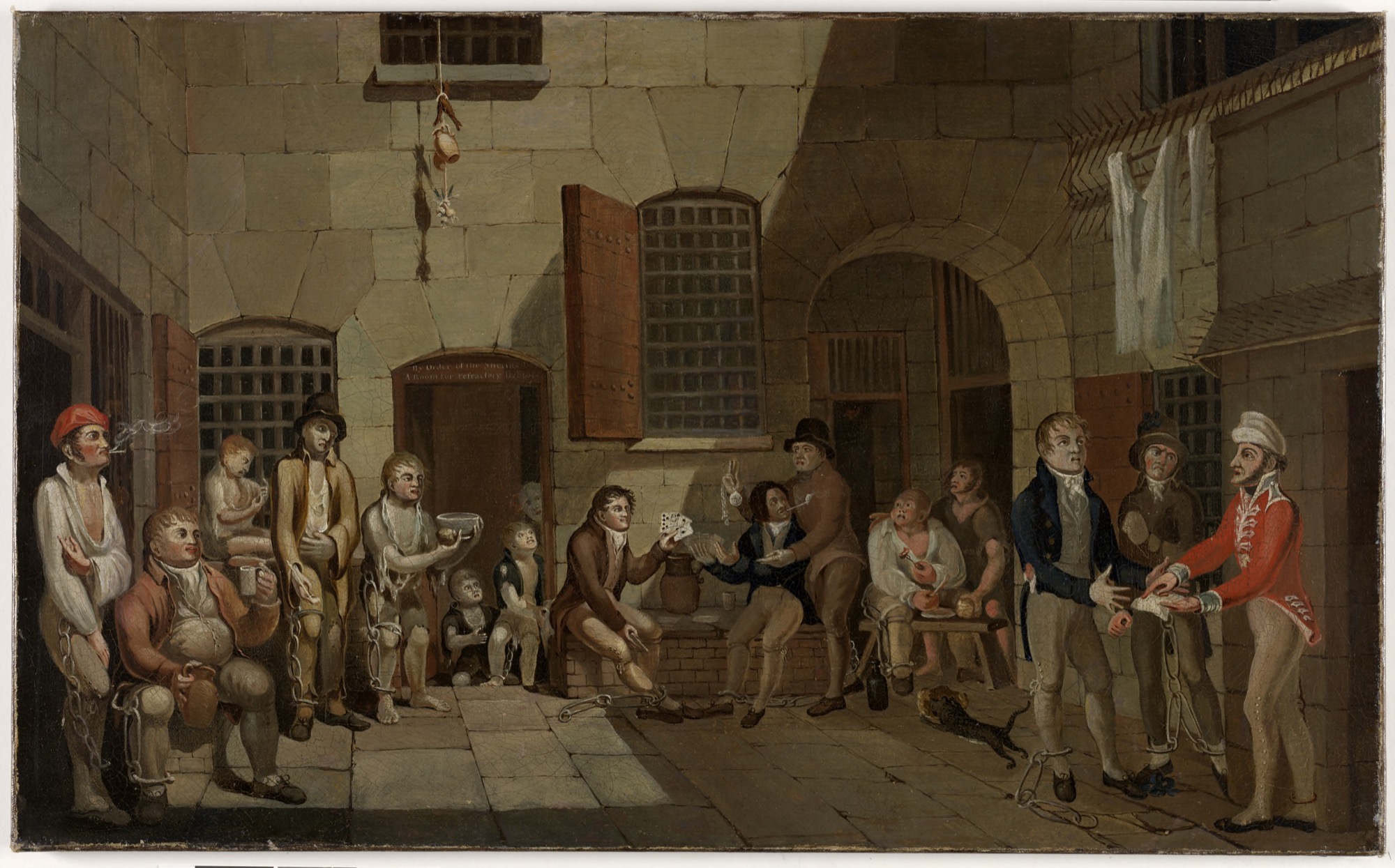 In Untitled [Scene inside Newgate], the sun beats down on the court from the opposite side of the canvas, indicating a different time of day to that depicted in The Mock Trial. From the uppermost window, heads of garlic and a ceramic vessel, presumably filled with vinegar, hang from a rope, placed there as a useless precaution against the “gaol fever” (typhus) that ravaged the overcrowded English prisons of the time. A few scraps of garments hang from iron spikes in the upper right segment of the painting, possibly remnants of a dramatic escape attempt, but more likely laundry hanging out to dry—sunlight was in short supply, after all.52 Meanwhile, a cat darts across the courtyard with something in its mouth. In eighteenth-century England, cats—long associated with the devil and witchcraft and tolerated only when employed in the service of catching vermin—were often cruelly treated.53 Prisoners of the Bristol Gaol and Bridewell had good use for them, however, purportedly having cats placed in their cells overnight to “stop the rats gnawing their feet.”54