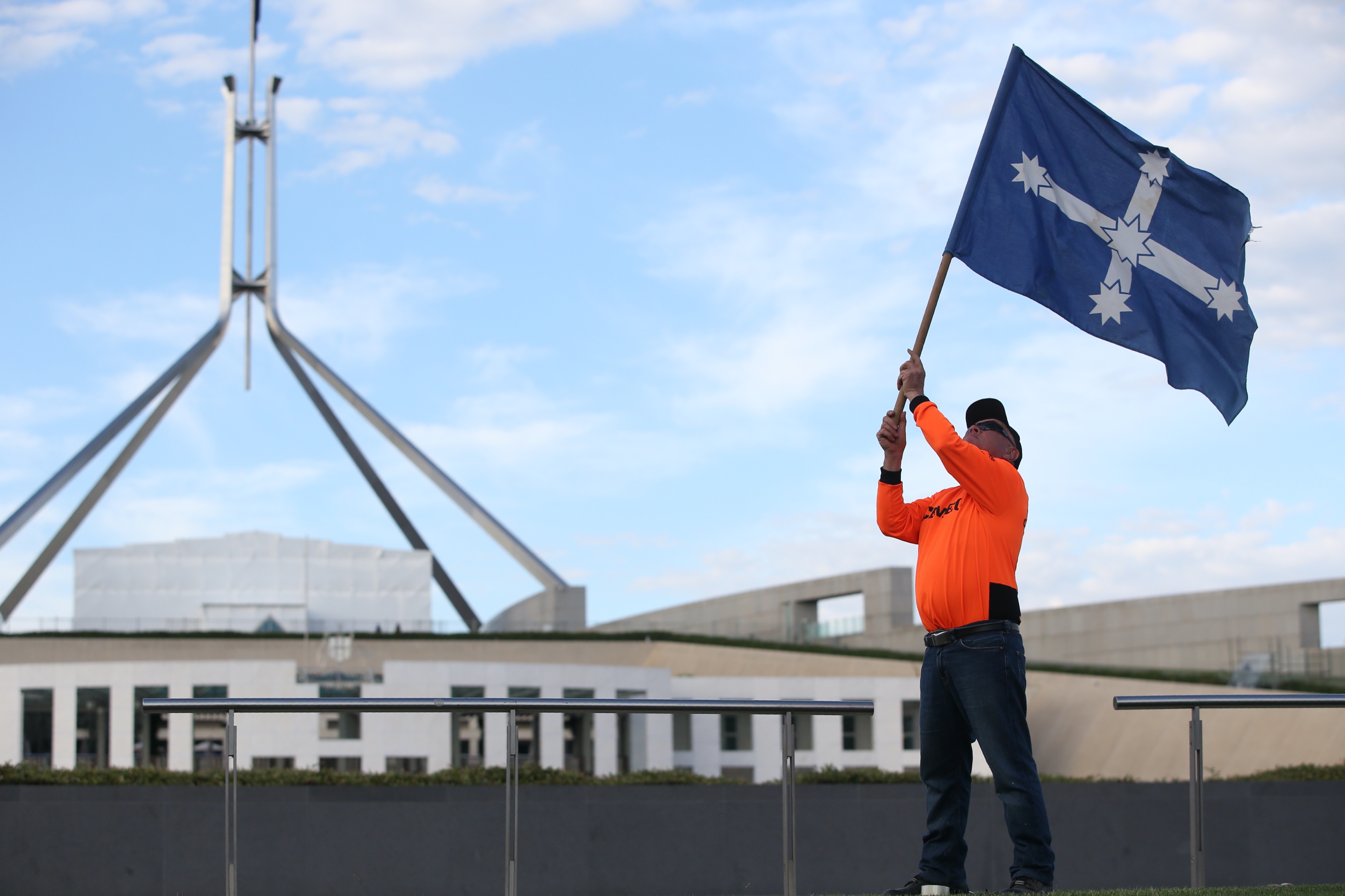 David Marin-Guzman, “Eureka flag ban faces constitutional challenge,” The Australian Financial Review, March 3, 2020, https://www.afr.com/work-and-careers/workplace/eureka-flag-ban-faces-constitutional-challenge-20200303-p546d6. ↩