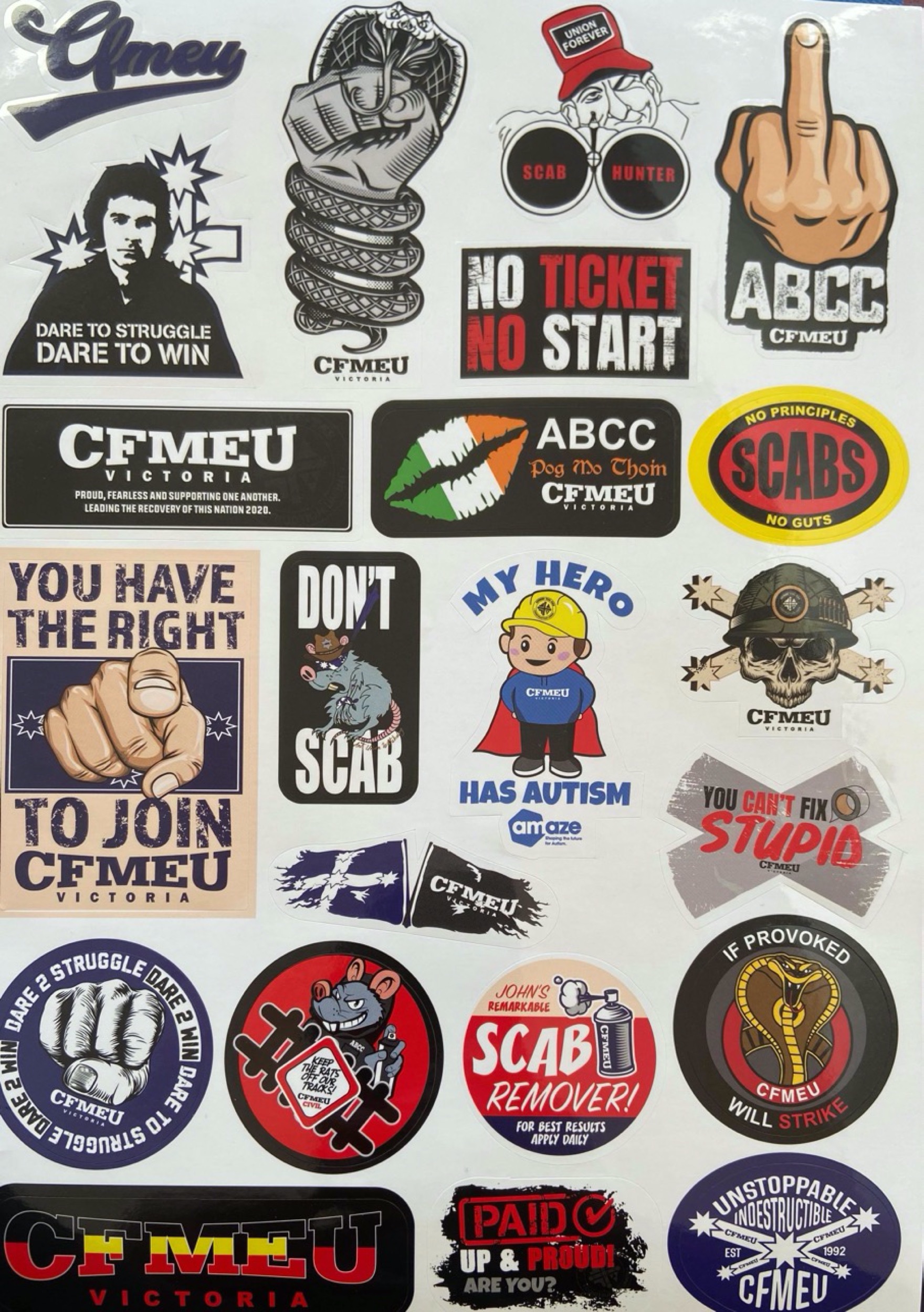 This was not the first visit by ABCC inspectors to this particular Melbourne site. Photos from previous visits note: “A stuffed animal can be seen hanging from the power cord to the air conditioning unit. The stuffed animal is wearing a black hard hat that is affixed with multiple stickers with logos, mottos or indicia of the CFMMEU” and “An esky is resting on a box beneath the stuffed animal. The esky has a number of union stickers attached to it. The owner of the esky is not known.”6 The inspectors collected a catalogue of images of CFMMEU stickers found on workers’ helmets, toolboxes and lunchboxes including the phrases “100% Union”; “There is Power in a Union”; “United we Bargain, Divided we Beg”; “Keep the dirty rats out”; “Danger, Militant Unionist”; “Dare to Struggle, Dare to Win”; “Grub Busters” and “If Provoked, Will Strike.”7 The inspectors reported that “during the site walk, Inspectors observed the crane crew chanting for the CFMMEU. A member of the crane crew was seen to be wearing [a Union Sticker covered hat].”8