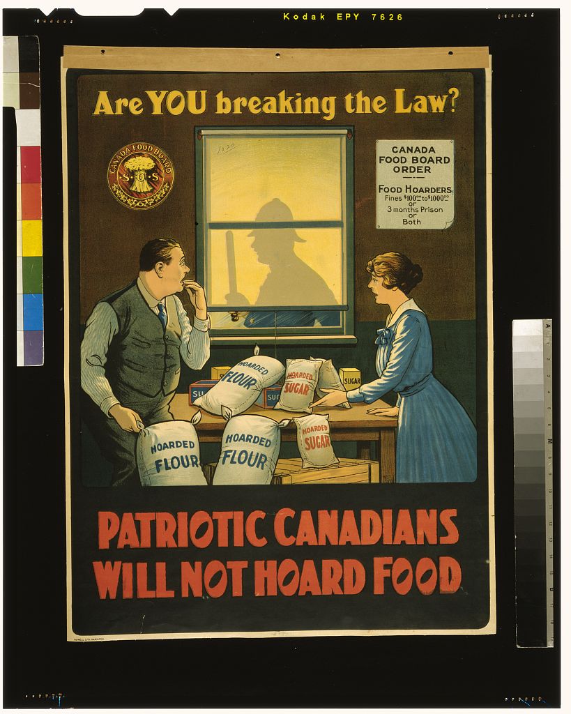 Yet, the ephemeral and quickly changing catalogue of illegal activities makes it difficult to portray illegality. Sometimes the simple use of criminal law imagery—such as representations of enforcement officers or penal methods—are sufficient. If illegality hides from the gaze of the law, the mere shadow of the law enforcement figure, such as in this WWI Canadian poster targeting food hoarders, should be sufficient in depicting it (fig. 1). In this poster, illegality is precisely illustrated by the mere shadow of a police officer outside the window. The shadow of the law signifies that, at what first glance appears to be a daily activity of organising a pantry, is in fact an outlawed activity of hoarding limited resources. The presence of the shadow of the law, powerfully communicates the fact that storing too many resources in one’s pantry during wartime is an illegal activity, regardless of whether it is visible to others. The symbol of the police officer links the seemingly innocent image of the couple sorting food with the criminal law sanction. It also captures the fear thereof in the guilty facial expressions of the hoarders. Where law casts its light, illegality can be uncovered and will not remain invisible for long.